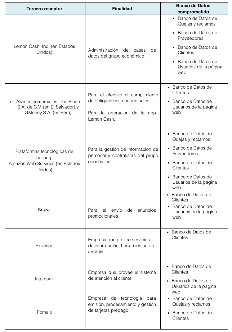 - DATOS TRANSACCIONALES: Registro relacionado con los pagos y transferencias de criptomonedas y/o dinero electrónico hacia y desde usted, y su historial de transacciones de la app Lemon Cash u otros Canales, exclusivamente relacionadas con los Servicios.