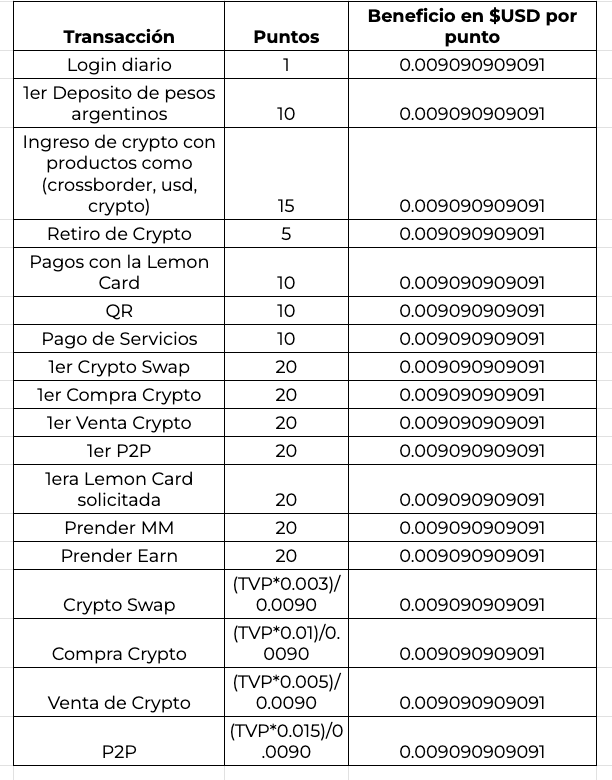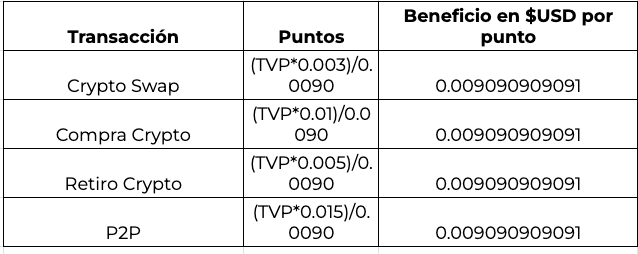 En el caso de Crypto Swap, Compra Crypto , Venta Crypto y P2P, los Puntos otorgados no son fijos sino proporcionales al monto transaccionado (TVP).