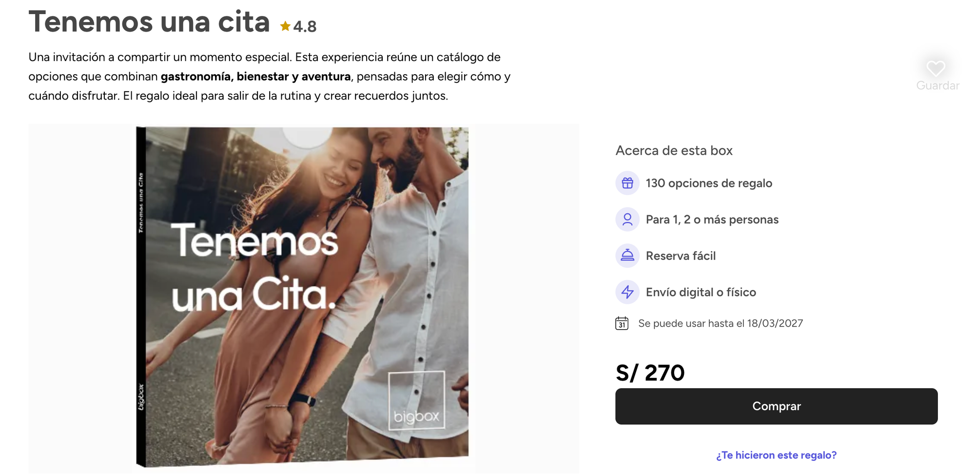 4.1. Descripción del Premio. Cada uno consistirá en la entrega de un voucher digital de BIG BOX con un monto acreditado de S/270 (soles peruanos doscientos setenta), para tener una experiencia para San Valentin